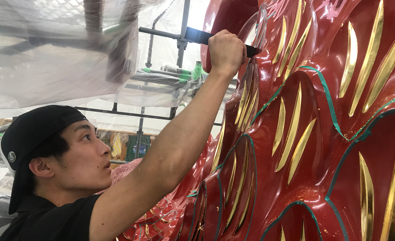 この鯱の修復は、伝統的に輪島塗の職人が手掛けてきました。今回は、輪島の田谷漆器店様が修復を担当することとなり、金箔については、技術的な信頼から箔一の名前をあげていただきました。最初にお声がけをいただいたのは、作業に入る2年ほど前のことでした。曳山の保存修復には、かなりの困難が伴うことはわかっていましたが、一定の準備期間もあり、こうした機会をいただいたことも成長のチャンスととらえて、まさに挑戦者の気持ちでお受けすることとなりました。