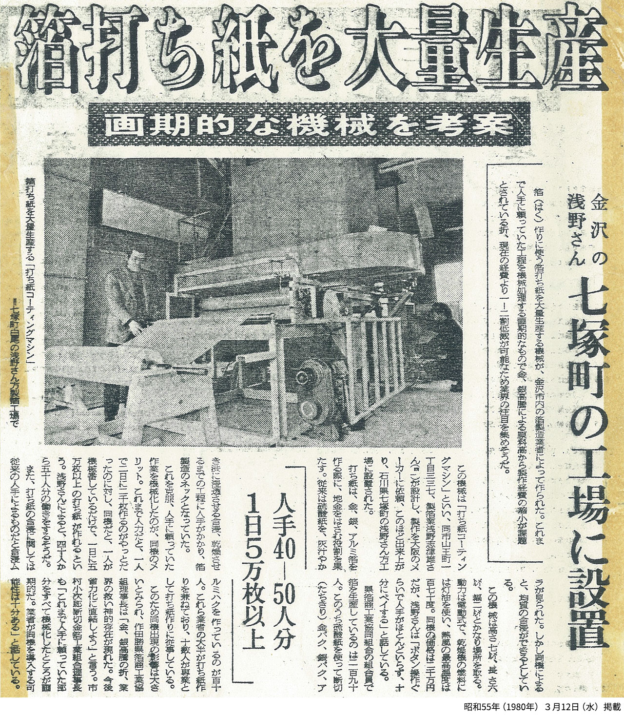 製造を自動化したことで、箔打ち紙の生産性は50倍も上がりました。また品質も安定したことから、金沢箔の安定供給につながりました。現在、大手のメーカー様にも金沢箔が採用されていますが、それも工夫の積み重ねによって供給力をつけてきたことの成果と言えます。なお、この箔打ち紙の製造機は、40年たったいまでも現役で稼働しています。