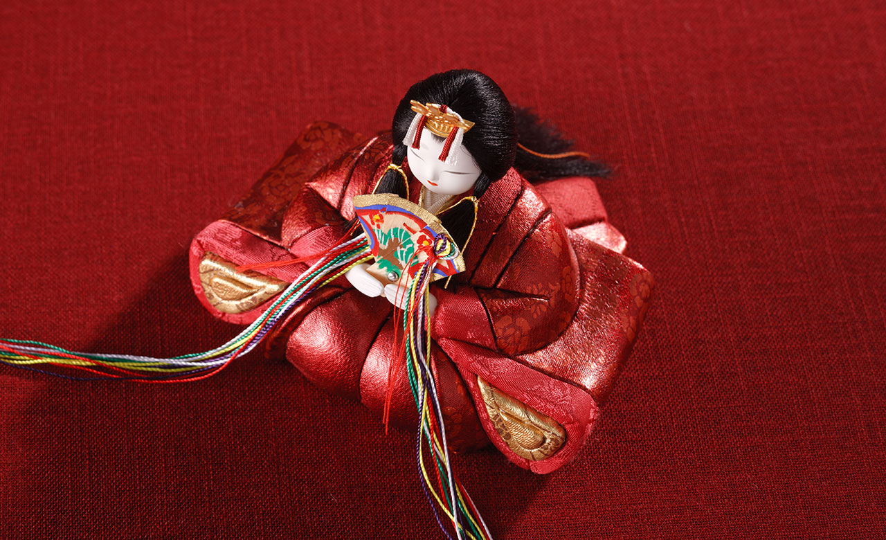 私たちの箔布は、美しい木目込み人形に使われています。木目込みとは木で作った本体に溝を彫り、そこに布を詰め込むようにして作る伝統的な人形です。このとき、布はかなり強い力で引っ張られるため、ここに箔をあしらうには高い技術が必要です。私たちは、箔布を使った木目込み人形を作っていますが、これは、箔一にしかできない技術です。雛人形や五月人形として喜ばれています。