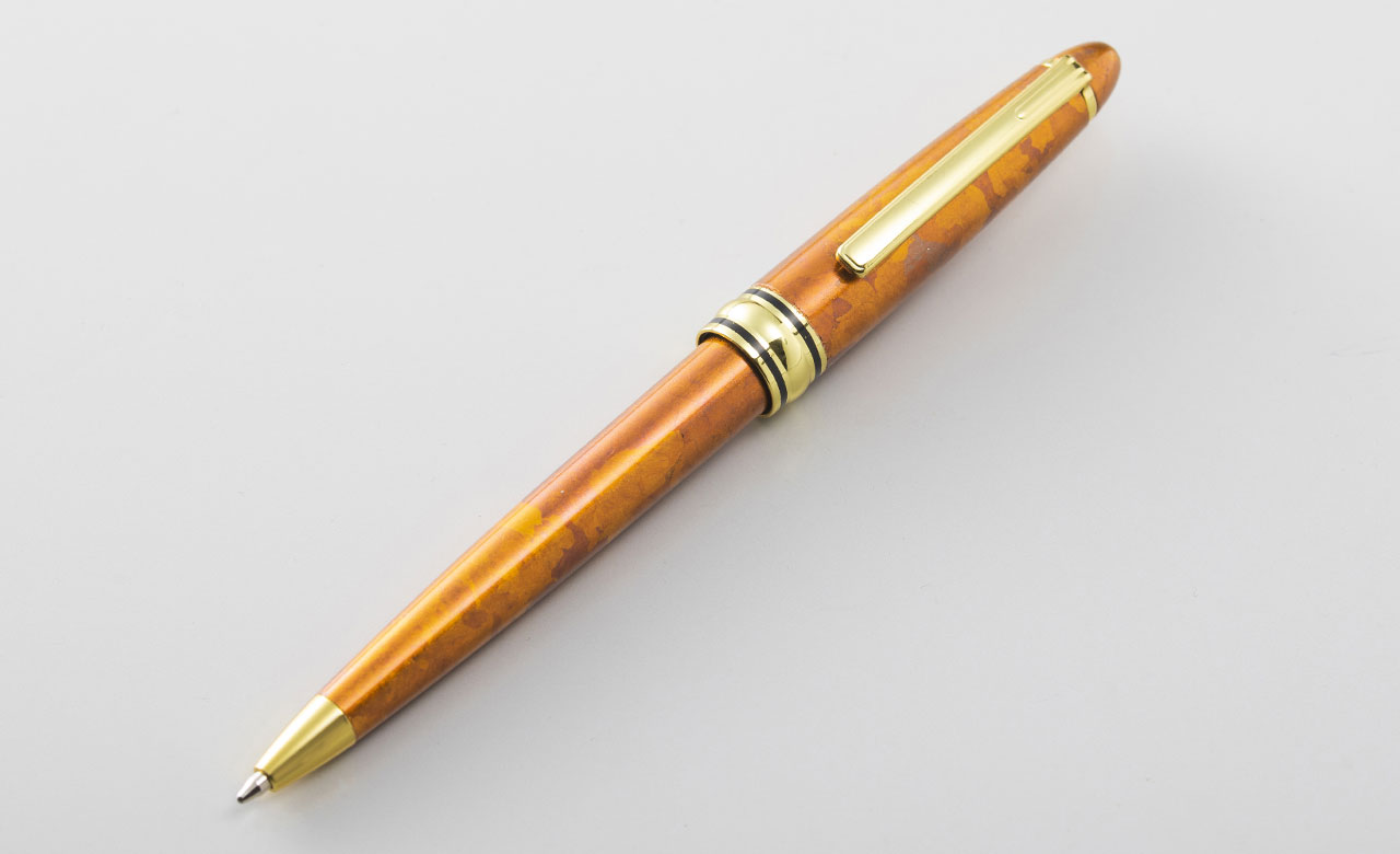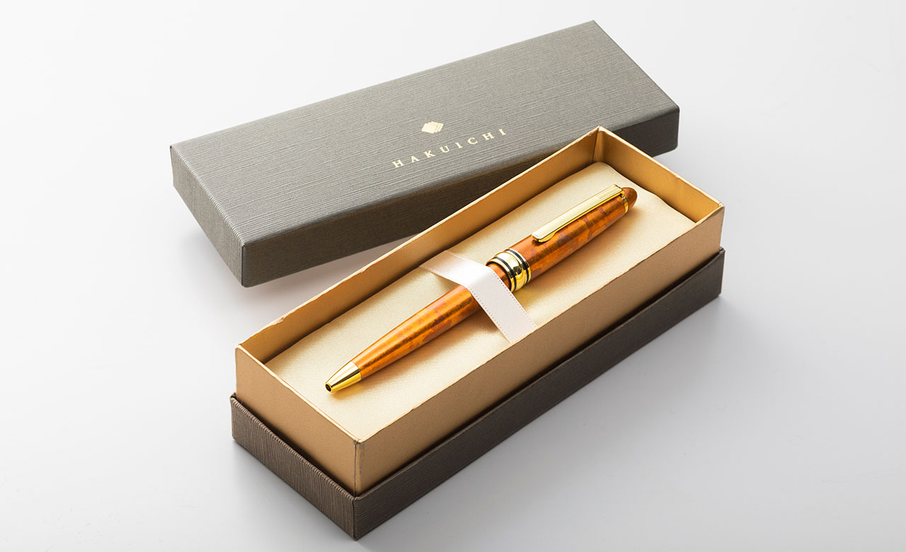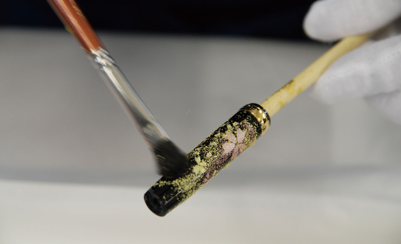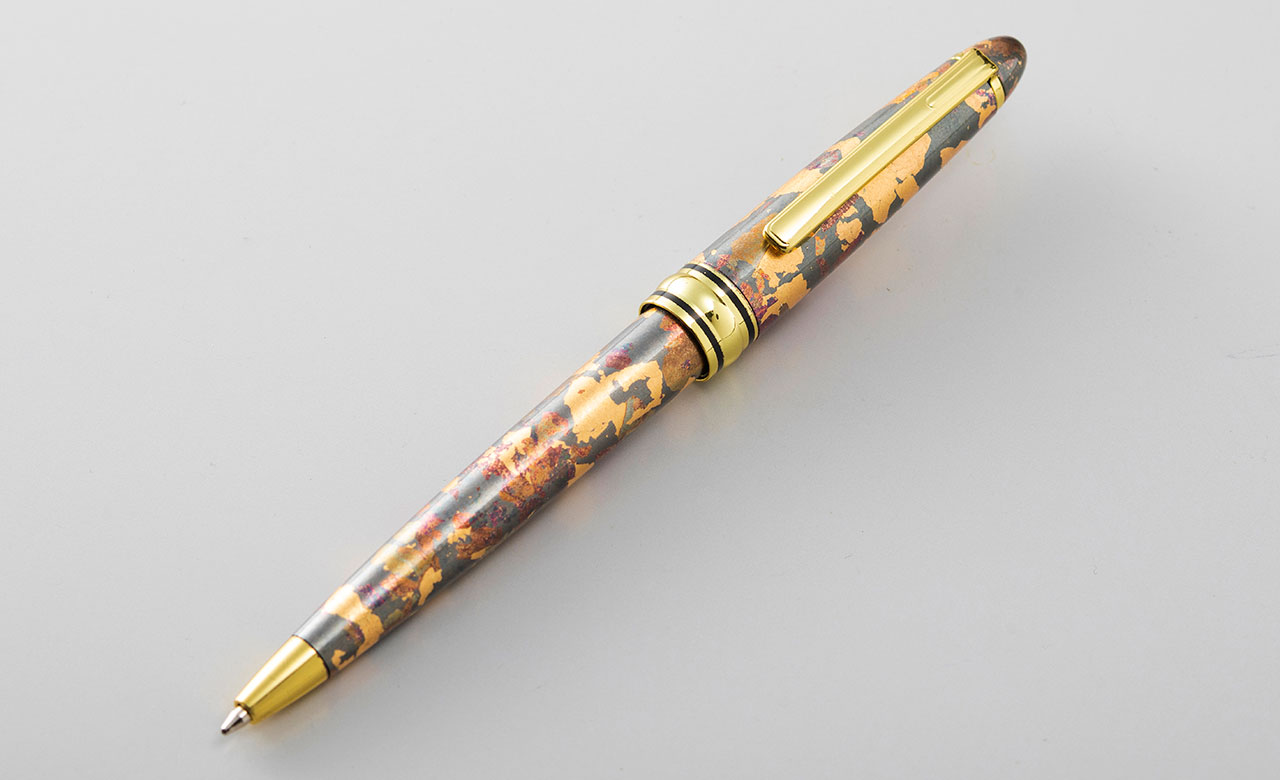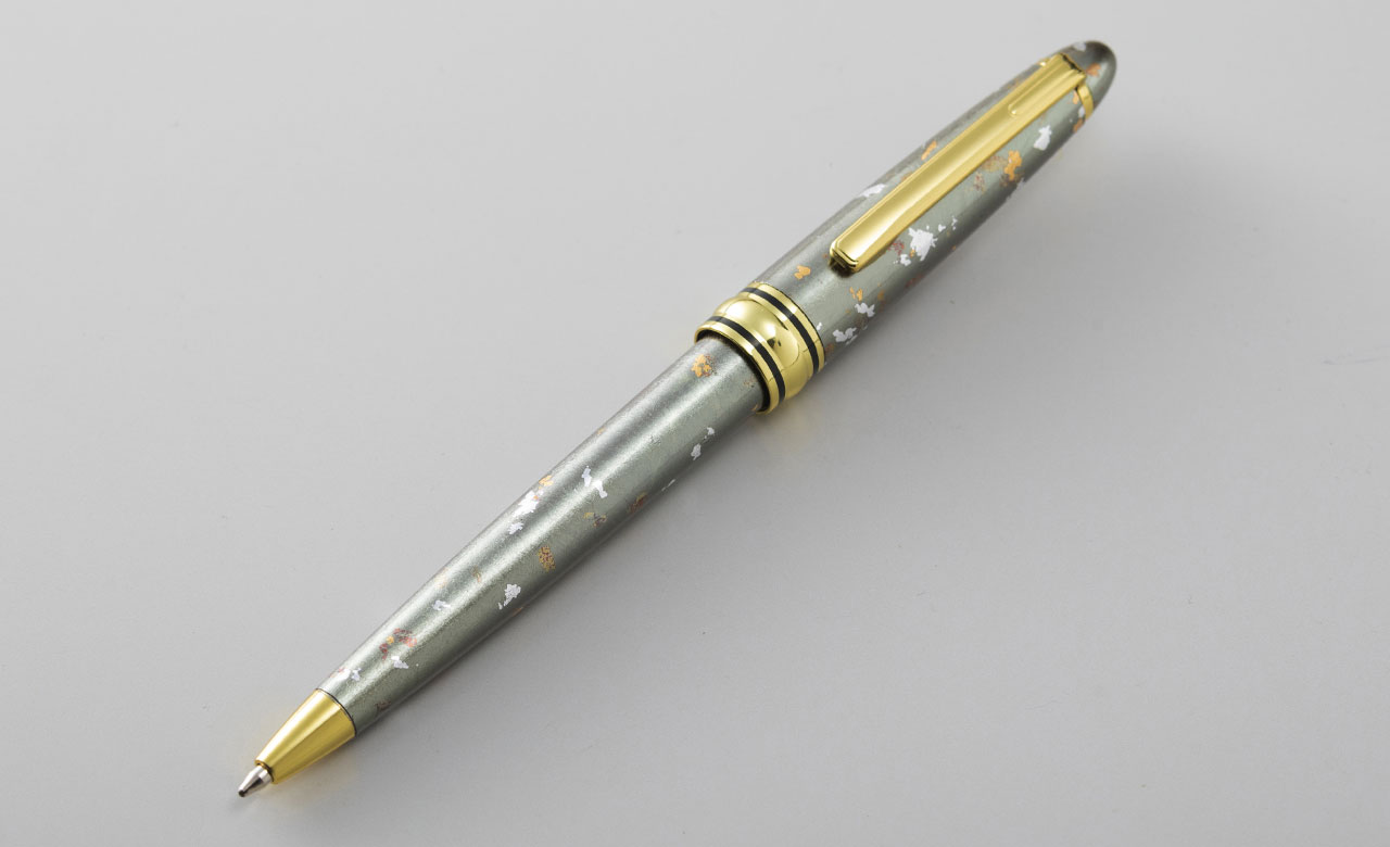 SHIKISAIボールペンは、このような行き場のない箔の切れ端に、新たな価値を見出した工芸品です。“もったいない”というだけの再利用ではなく、端材だからこその美しさを表現することにこだわっています。箔の切れ端は、工芸品に箔をあしらった後に刷毛で払ったり、竹箸でちぎったりすることで生まれます。その工程で、複雑な形状に砕けていき、人為的には作れない個性的な表情をもちます。これを活かせないかと考え、試行錯誤を重ねた上に生まれたのが、このデザインです。