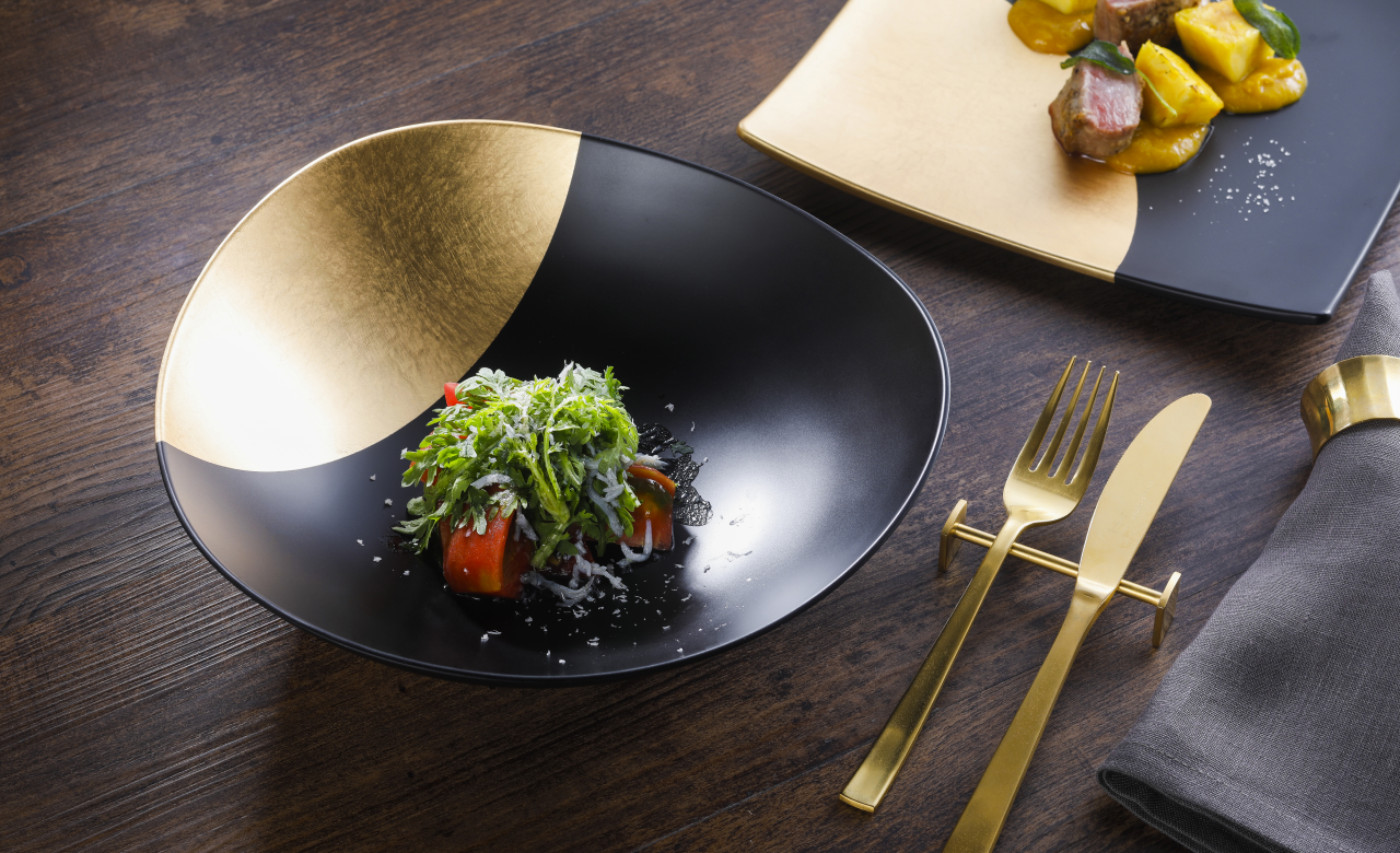 また、このデザインは、実用的な面でも優れています。 金と黒のシンプルな色彩は、様々な料理に使えようにと工夫しました。美しい盛り付けの基本ルールとして、「青黄赤白黒」の5色の使い分けが大切とされています。そのなかで、黄は華やかさを演出し食欲増進を促す色として、また黒は食材を引き締めて色や形を美しくみせる色とされています。これらの色の効果で、食卓を華やかにしてくれるうえ、お皿の上の料理も美しく見せてくれます。