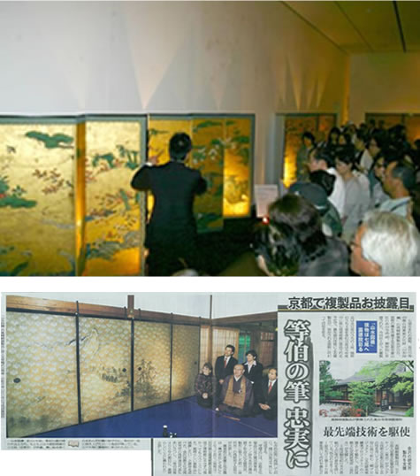 数百年もの時を超え受け継がれてきた美しさを、後世に伝えるために、現代のデジタル技術による最高レベルの技法と、永く継承されてきた伝統の職人技をあわせることで、高精細の複製品をつくり上げました。複製品は保存される現物に代わり、展覧会を行うなどより多くの人の目に触れる機会を作る役割を担っています。また原画は当時の技術を研究し、修復することで後世に美しいまま残していくだけでなく、その当時の技術を修学し、その技術を継承することに努めています。これら文化財保全活動を通じて、箔一は日本美術の礎となる名品を、後世に伝えていきたいと考えています。