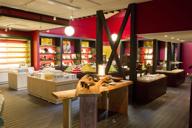 そうして生まれた店内は、心地の良い広々とした空間となりました。高い天井も、銭湯時代の名残です。内装デザインは、茶屋街らしい弁柄色を基調とし、格子も取り付けました。せっかくの快適なスペースですので、すべてを売り場とせずに、一部を金沢の情景を模した休憩スペースにしました。また2階には、ギャラリーも設けました。
