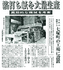 箔一は、それまで一日に人手を使って3000枚までの製造量だった箔打ち紙を、50000枚まで製造可能な機械を考案。画期的な業務効率を実現した。