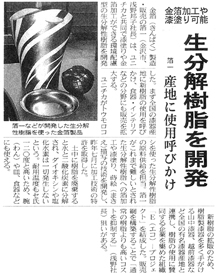 箔一は、樹脂提供のユニチカ、及び成型加工の塩崎化成工業と連携し、漆塗りや箔加飾を施した環境配慮型の生分解性樹脂を用いた成型品を開発。従来、耐熱性や耐久性に課題があり、製品化は難しいとされていた生分解性樹脂への箔加飾や漆塗り、蒔絵描写の技術を適用させて製品開発を推進。加工技術に関しては2004年7月に特許も取得した。