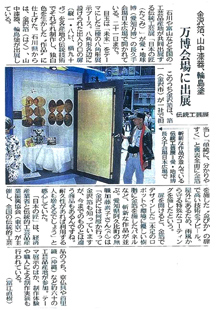 箔一が愛・地球博(愛知万博)に、経済産業省と伝統的工芸品産業振興会主催の伝統工芸品展「日本の匠(たくみ)」が愛・地球博の長手会場日本広場にて、平成17年5月9日~5月21日の期間開催されました。 箔一は、経済産業省から依頼を受け金沢箔から唯一代表として、新技術「日本の伝統工芸」と「家庭用向け二足歩行ロボット」との融合を施した金箔蒔絵(まきえ)風デザインモデル「nuvo~Japanism」と、環境に優しい樹脂「生分解性樹脂」を用いた全く新しい金沢箔工芸品を出展致しました。