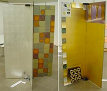 しかし、当社独自の箔加工技術を活かし、箔ちらしや箔絵などの技法をタイル上にそのまま表現できる技術を開発致しました。箔加飾タイルは色合いや艶、装飾性だけでなく、これまで使用困難とされていた水回りにも使用できる耐久性を備えます。