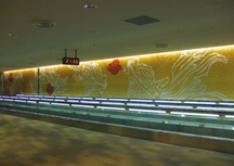 箔一は、成田空港旅客ターミナルで、金沢箔を使った壁面装飾を完成させました。日本の玄関口として大勢の外国人が往来するだけに、「金沢の伝統美と技術をアピールできる絶好の場」と位置づけています。箔で加飾したのは、南北ウイングを結ぶ第一旅客ターミナル三階のメーン通路で縦3.5 m、長さ30mの壁面2本。一本はオリジナルの色彩箔をベースに雲の中を銀の金魚が泳ぎ、もう一本は銀箔の上に金魚が泳ぐデザインを施しました。雲は箔粉で仕上げました。