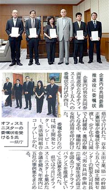 2008年7月4日(金)、石川県庁において企業内の男女参画推進役となるオフィスミニスターの委嘱状交付式が行われました。このたび、当社の常務取締役竹本がオフィスミニスターに就任し、谷本正憲知事より委嘱状を拝受いたしました。