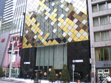 同ビルは銀座七丁目に立地する楽器製造のヤマハ(本社:浜松市)が運営する「ヤマハ銀座ビル」。1951年に完成したビルの老朽化に伴い、2007年より立て替え工事を始めました。「伝統と革新の融合」というコンセプトから金沢の伝統産業である「金箔」を選択、濃淡の違う3種類の金箔のガラスパネルが、昼と夜、表情を変えて銀座通りに輝きます。これまで建材に活用されてきた合わせガラス技術が、外装用に絶えうるレベルまで開発、実現しました。
