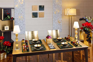 3,000点にも昇るコーディネート応募から、箔一の提案3点が審査員の目に留まり、入賞を果たしました。いずれもテーマに沿った華やかなコーディネートで、インテリアも含めたトータルコーディネート力が評価されました。