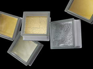 従来、タイル表面に焼き付けるのは金澄・銀澄と言われる箔になる前の厚みのあるもので色合いも金銀しか表現できませんでした。