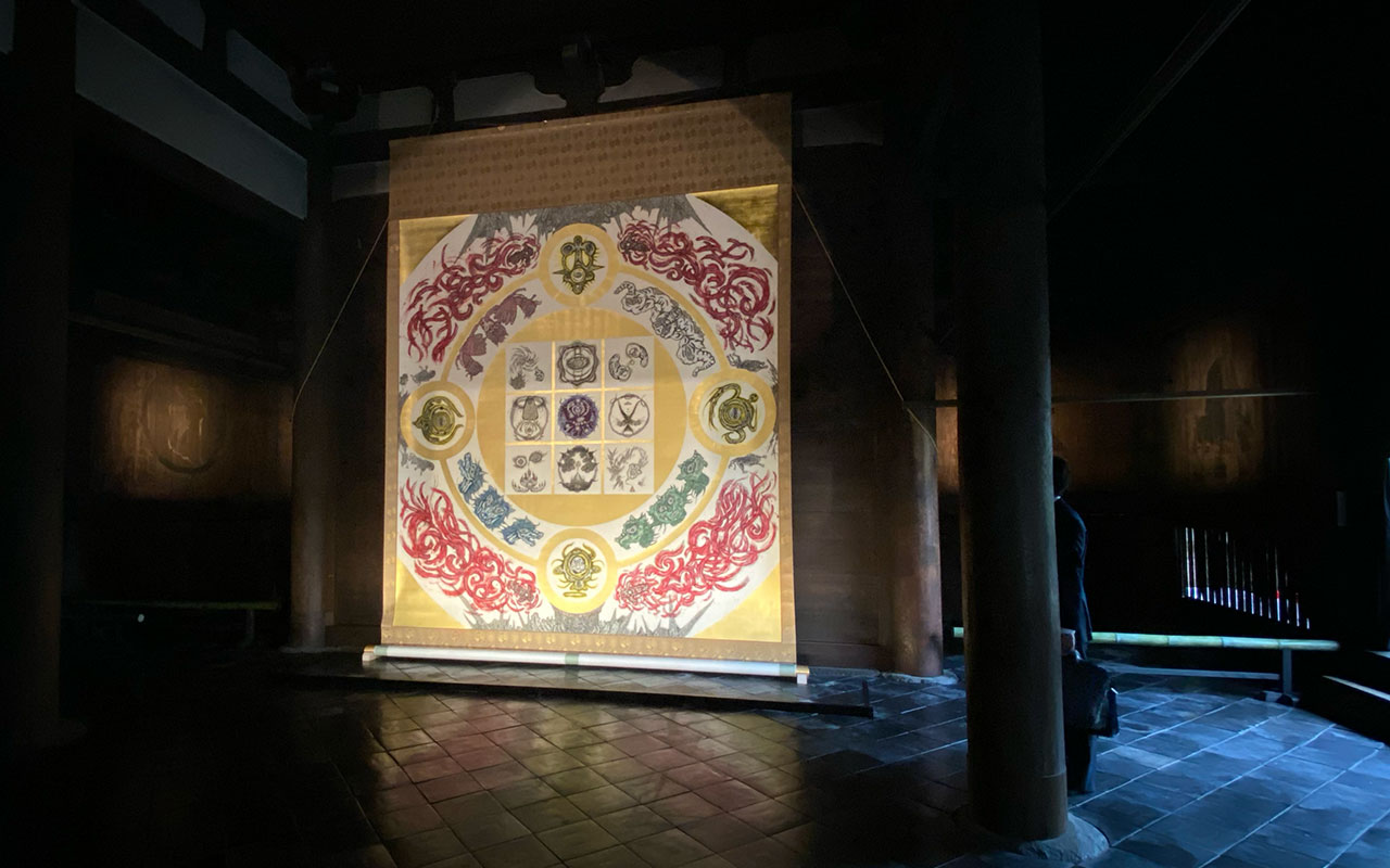 京都の東寺にて行われた真言宗立教開宗1200年記念の大法会にて、現代アーティスト小松美羽さんの大作「ネクストマンダラ―大調和」が奉納されることとなり、四方およそ4メートルもの巨大な絹本の金箔加飾の制作を担当させていただきました。