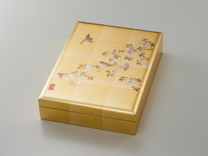 特別な加工で風合いを表現した金沢箔を、一枚一枚手ちぎりで貼り仕上げた収納箱です。桜の花と佇む小鳥は立体的に描く独特の装飾技法を施し日本の美を描いた人気の高いお品です。