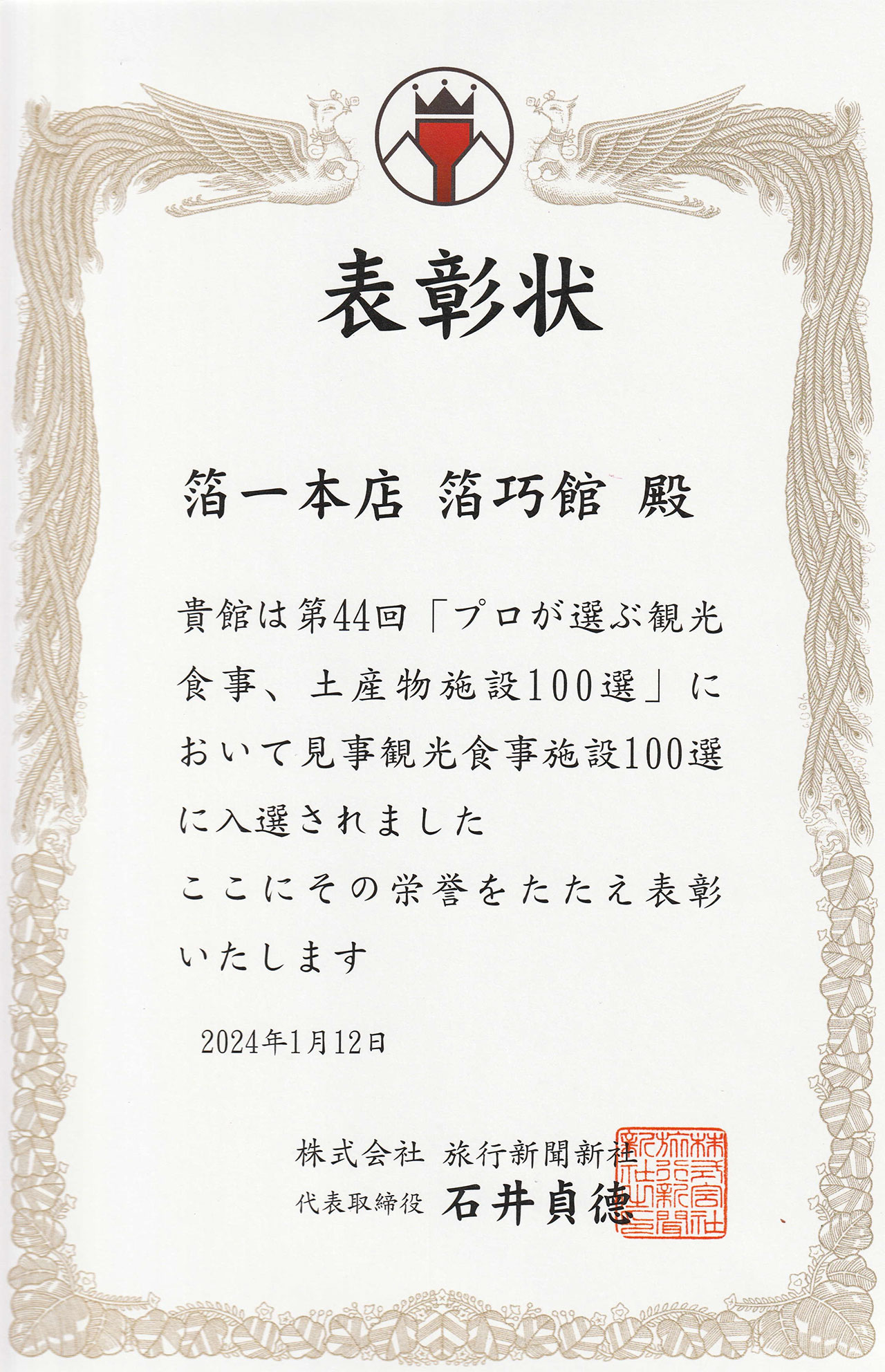 『箔一本店 箔巧館』が通算15回目となる、旅行新聞新社主催「プロが選ぶ観光・食事・土産物施設100選」(2024年1月発表)において、選ばれました。
