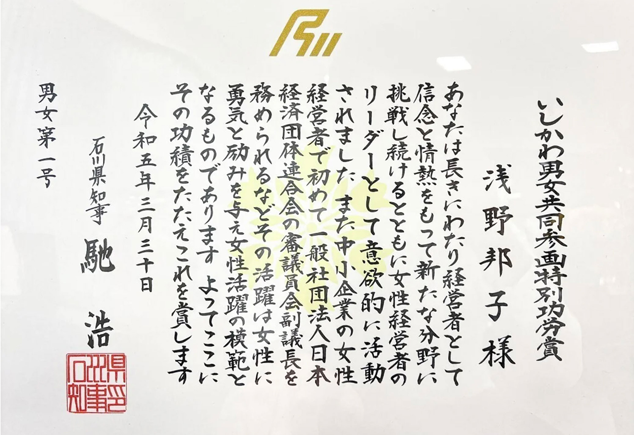 石川県は、2022年度に女性活躍の模範となる個人を表彰する「いしかわ男女共同参画特別功労賞」を創設。その第1号として弊社創業者の故浅野邦子(2023年2月9日永眠)が選ばれました。