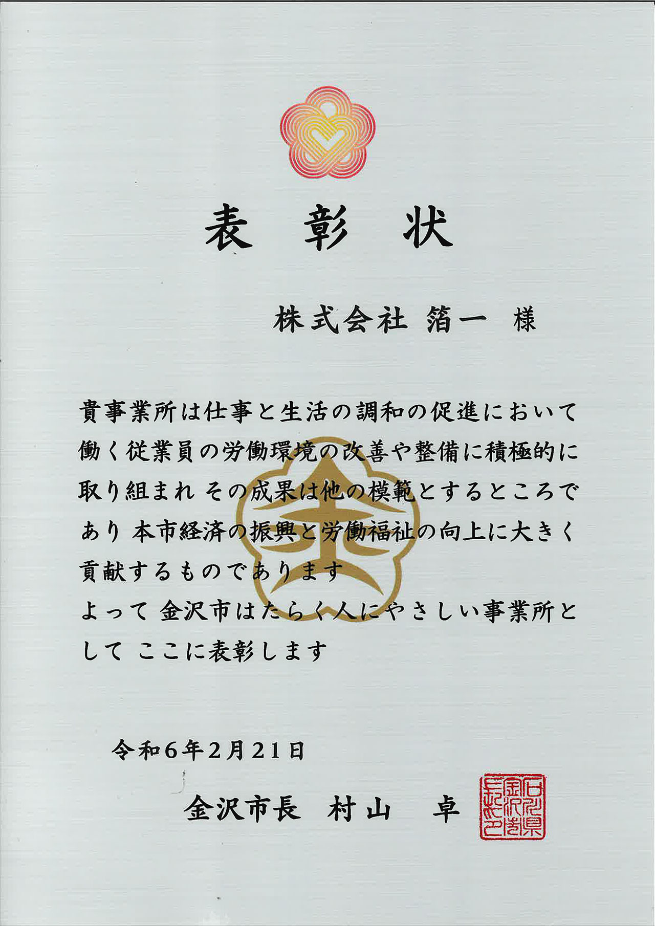 金沢市より「はたらく人にやさしい事業所」として表彰されました。仕事と生活の調和や労働環境の改善に積極的に取り組み、具体的な成果につなげている事業所を表彰しているものです。市長から我が社の取り組みとして、女性の活躍や、社内のクラウド課、社内報などの情報発信、非正規雇用の従業員を正規社員と同水準にする準社員制度の仕組みの導入などを評価していただきました。