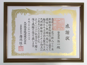 株式会社箔一が、九州旅客鉄道(JR九州)の新型車両「800系 U-007」編成の内装に、金箔を装飾した事業において、JR九州のイメージアップに貢献したとして、感謝状が授与されました。