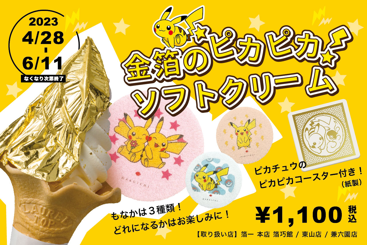 「ピカチュウもなか」付き「金箔のかがやきソフトクリーム」の販売を実施。付属の「ピカチュウ ピカピカコースター」付きで、コースターは、2023年3月に国立工芸館で開催された「ポケモン×工芸展」を記念したデザインとなっていました。そのほかピカチュウ金箔ハガキ体験も開催しました。