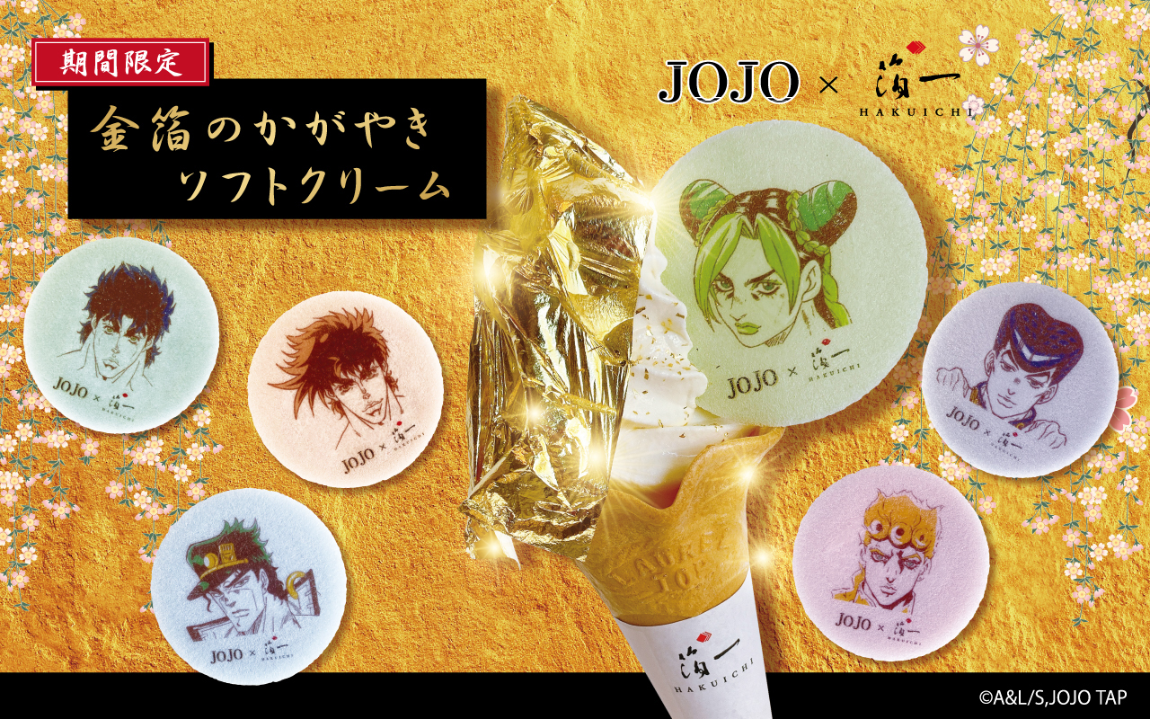 箔一と、アニメシリーズ「ジョジョの奇妙な冒険」とコラボした「金箔のかがやきソフトクリーム」と「金沢箔コンパクトミラー」を発売。