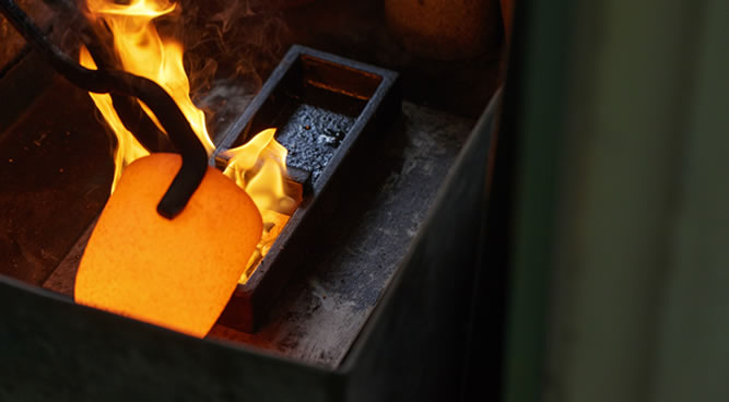金、銀、銅を1300度に熱したるつぼに入れ、約10〜15分溶解させたあと、型に流して成形します。