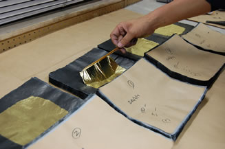 断切金箔とは、グラシン紙にカーボンを塗った箔打紙を使って打ち延ばす製法です。金箔の種類による合金の配合率は縁付箔と同じです。昭和30年後半~50年の間に金箔の生産量を増加させるために開発された技法で、縁付金箔に比べて紙の仕込みの時間などが削減され、比較的短時間で仕上げる事ができます。金箔の仕上げは、縁付金箔は一枚ずつ竹枠で切り揃えるのに対して、金箔と合紙を交互に挟んでいき、1000枚の金箔の束をまとめて規定の大きさに切ります。一気に裁断する事から、断切金箔と呼ばれている製法です。縁付金箔に比べて断切金箔は、和紙の凹凸が出ない事から艶がある光り方が特徴です。