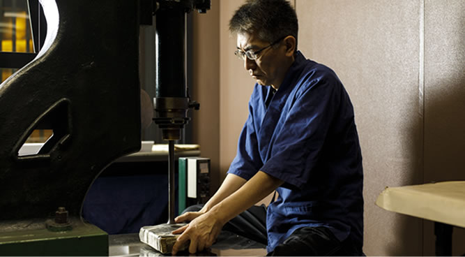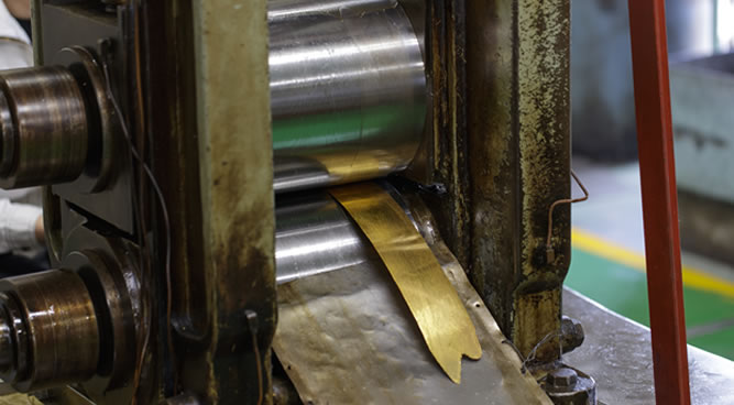 合金したものを、圧延機で帯状に延ばします。20回ほど繰り返し、100分の2~3mmまで薄くします。これを約6cm角に切ります。