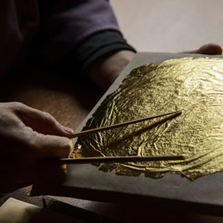 日本で最初の金・銀箔がいつごろ作られたのか、詳しいことは正確に解明されていません。古くは金箔が施された古墳時代のアクセサリーが発掘されています。また、金は古代から永遠、不変を象徴するとして、寺院建築や仏像彫刻に使われてきました。平安、室町、安土桃山と発展する日本の仏教文化の浸透とともに中国伝来の製箔技術がやがて日本独自のものとして定着し、今日へと発展してきたといえます。金沢でいつの時代から金箔、銀箔の製造が始まったのか定かではありませんが、加賀藩の藩祖・前田利家が、文禄2年(1593)に豊臣秀吉の朝鮮の役の陣中より、明の使節団の出迎え役を申し渡され、武者揃えの槍(やり)などを飾るため、領地の加賀、能登で金箔、銀箔の製造を命じる書を寄せているのが始まりとされています。