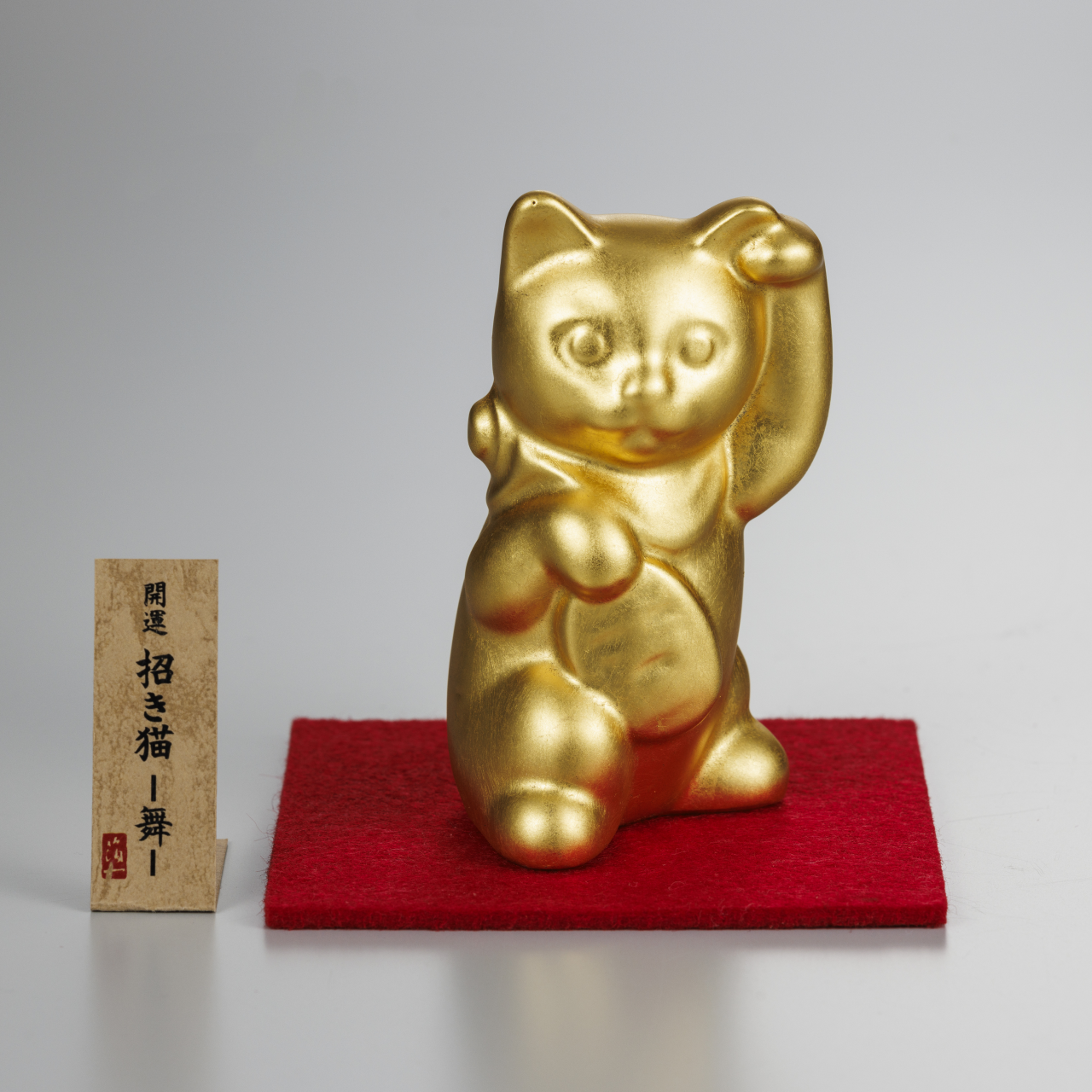 舞いたくなるほどの幸運がやってくる猫です。左手を上げ、良縁を招き入れます。