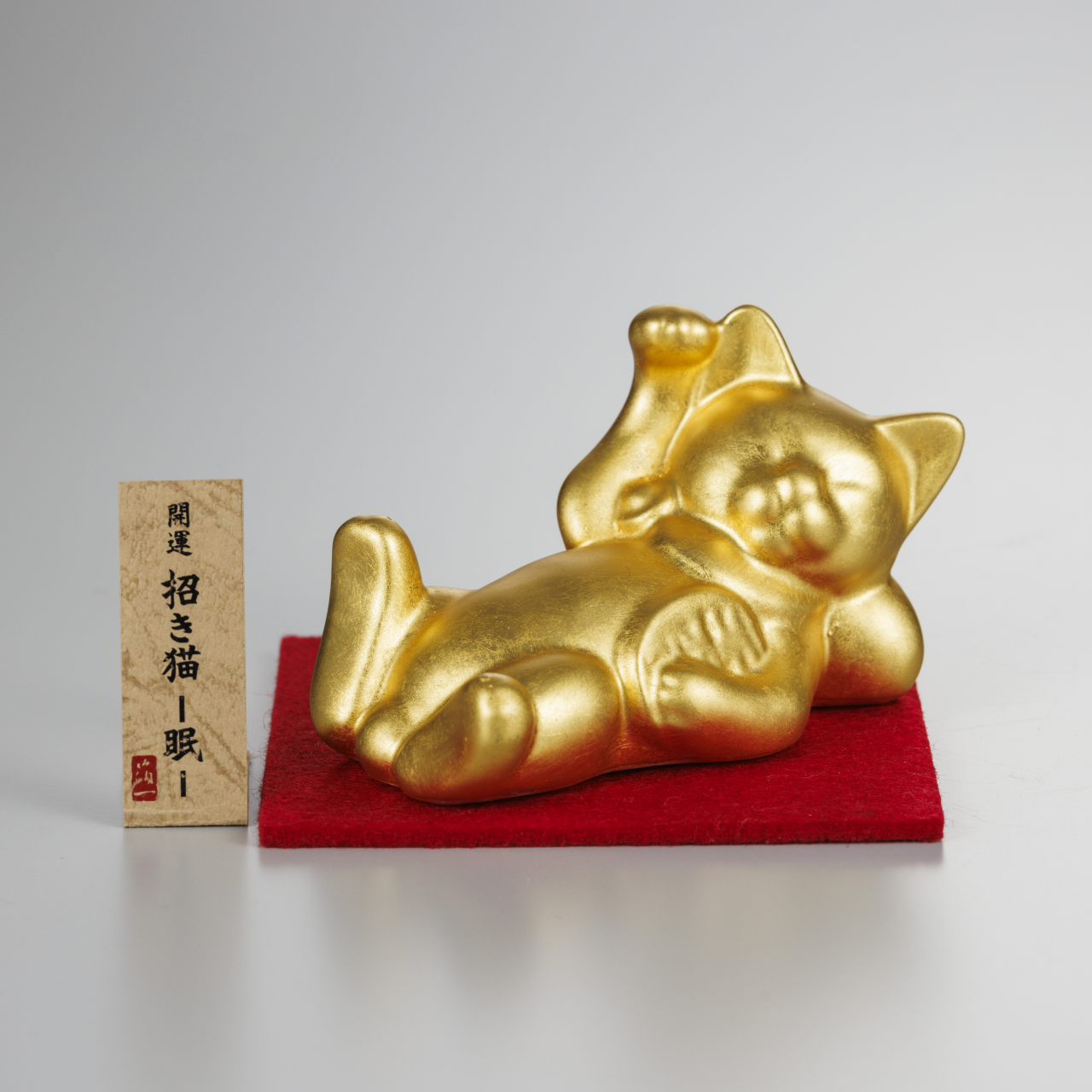 「果報は寝て待て」のことわざ通り、寝ながら福を招いている猫です。右手を上げ小判を持ち、富を招いてくれます。