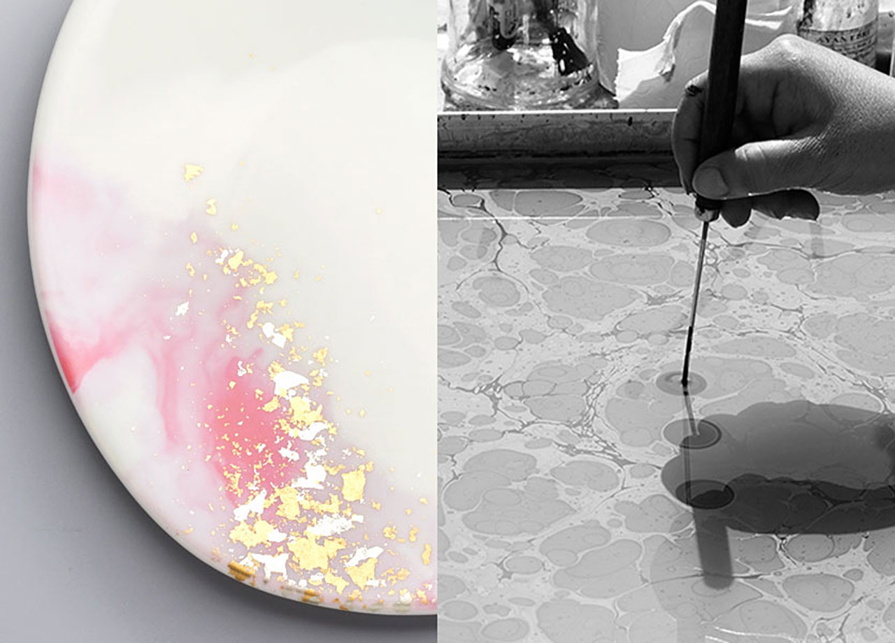 こうした美しい景色を、淡い色彩で表現をしたのがこのシリーズです。イメージを形にするために、日本古来の芸術である墨流しの技法を用いました。墨流しとは、色とりどりの墨を水に流すようにして浮かべ、そこに生じるマーブル模様を写し取る技法です。箔一では、この技法を研究し、陶器に応用しました。