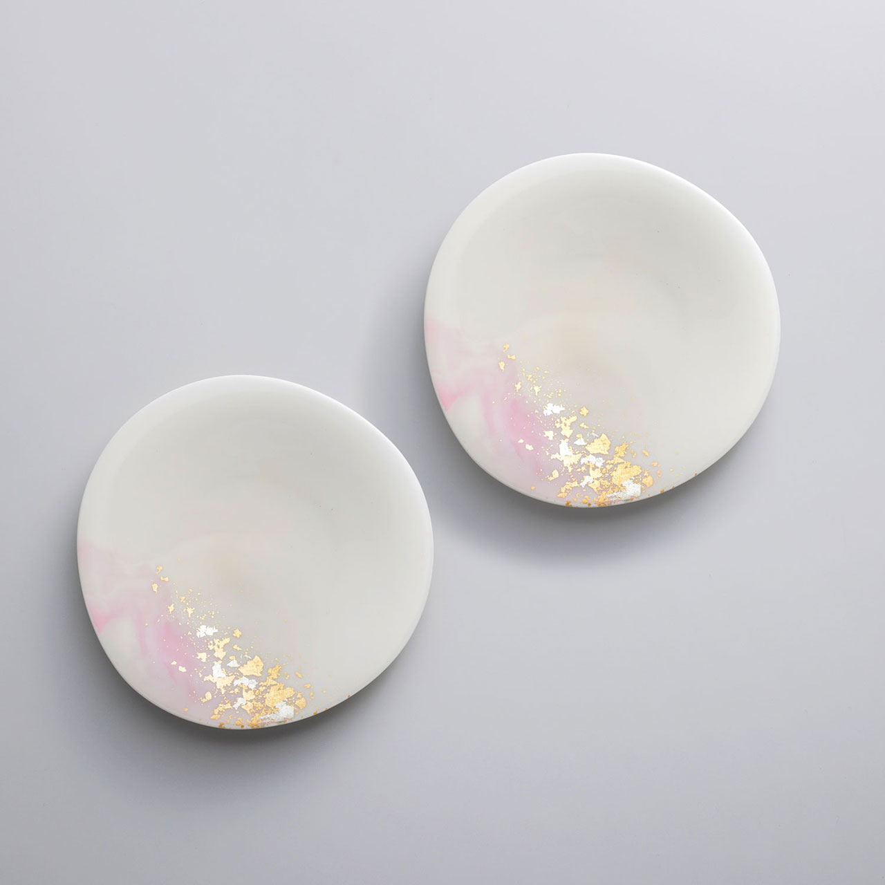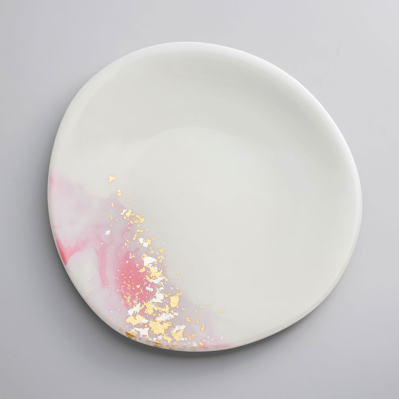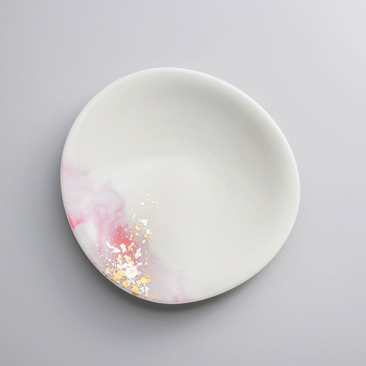 淡いほんのりとした桜色を、白とピンクのマーブル模様で表現しています。そこに本金箔とシャンパンゴールド箔を散らしました。金箔ならではの煌めきと風に吹かれて舞うようなデザインは、桜の美しさ、儚さを表現しています。あたたかみのある陶器特有の白色に、水彩絵具のような淡い模様が映え、日本的な美意識をモダンに表現しています。
