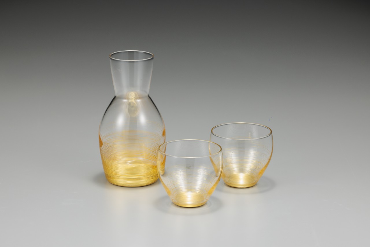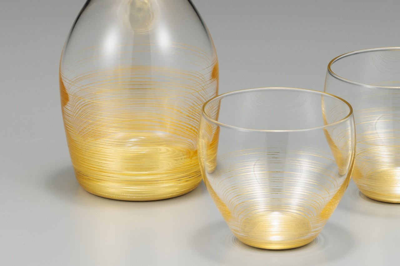 糸の様に細い筋が何本も重なる繊細な千筋文様。この日本らしい文様を金箔で表現した美しいガラスの酒器です。このセットでは、徳利やぐい吞みといった伝統的な酒器の形状を踏襲しつつ、モダンな素材とデザインを組み合わせることで、現代の食卓にもあわせやすい形としました。華やかな酒器セットは、ご自宅用はもちろん、慶事での贈り物に特に喜んでいただけるでしょう。
