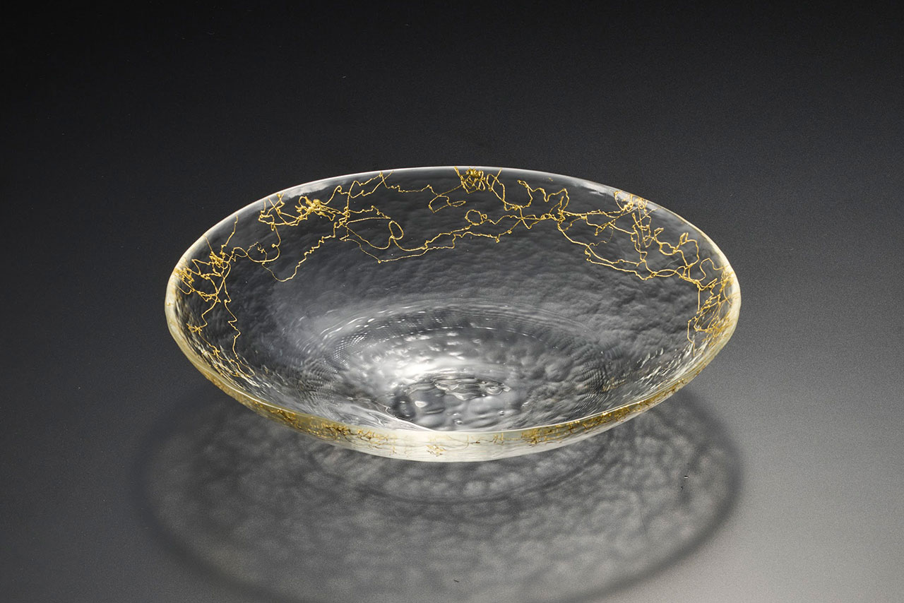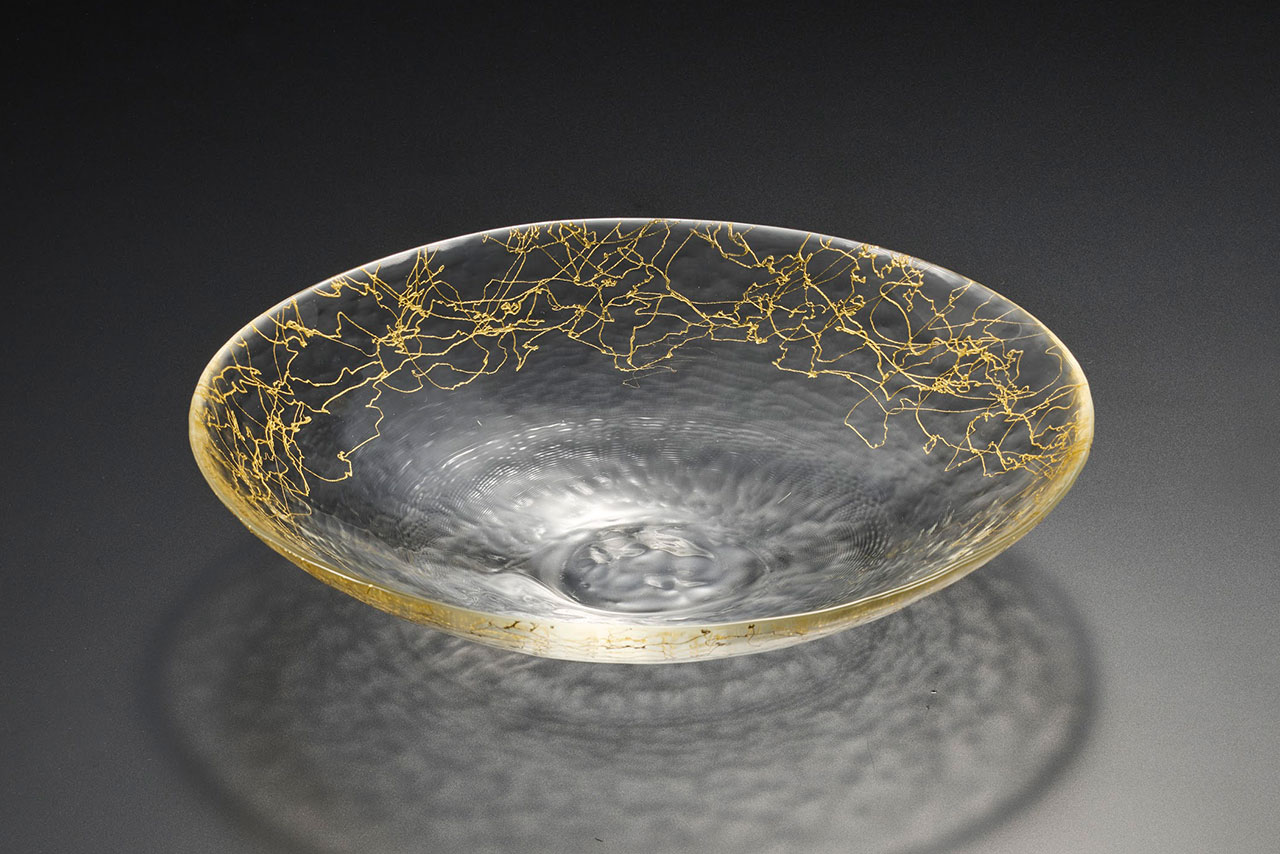 一つひとつ手作業で仕上げた器は、ハンドメイドならではのやわらかなフォルムと、ガラスの揺らぎが生む透明感の中に、ぬくもりを感じさせます。そこにあしらわれたのが、箔一オリジナルの金糸文様です。金の糸は縁(えにし)を象徴する、縁起の良い文様です。器の周辺で縦横無尽に輝きを放つ金箔の糸は、盛り上げの技法などによって、多彩な表情を感じさせます。 複雑に交差するその糸は、時に繊細に、時に力強く、見る角度や光の加減によっても異なる輝きを見せてくれます。目を奪うような美しさと奥行きは、まさに職人技の賜物です。