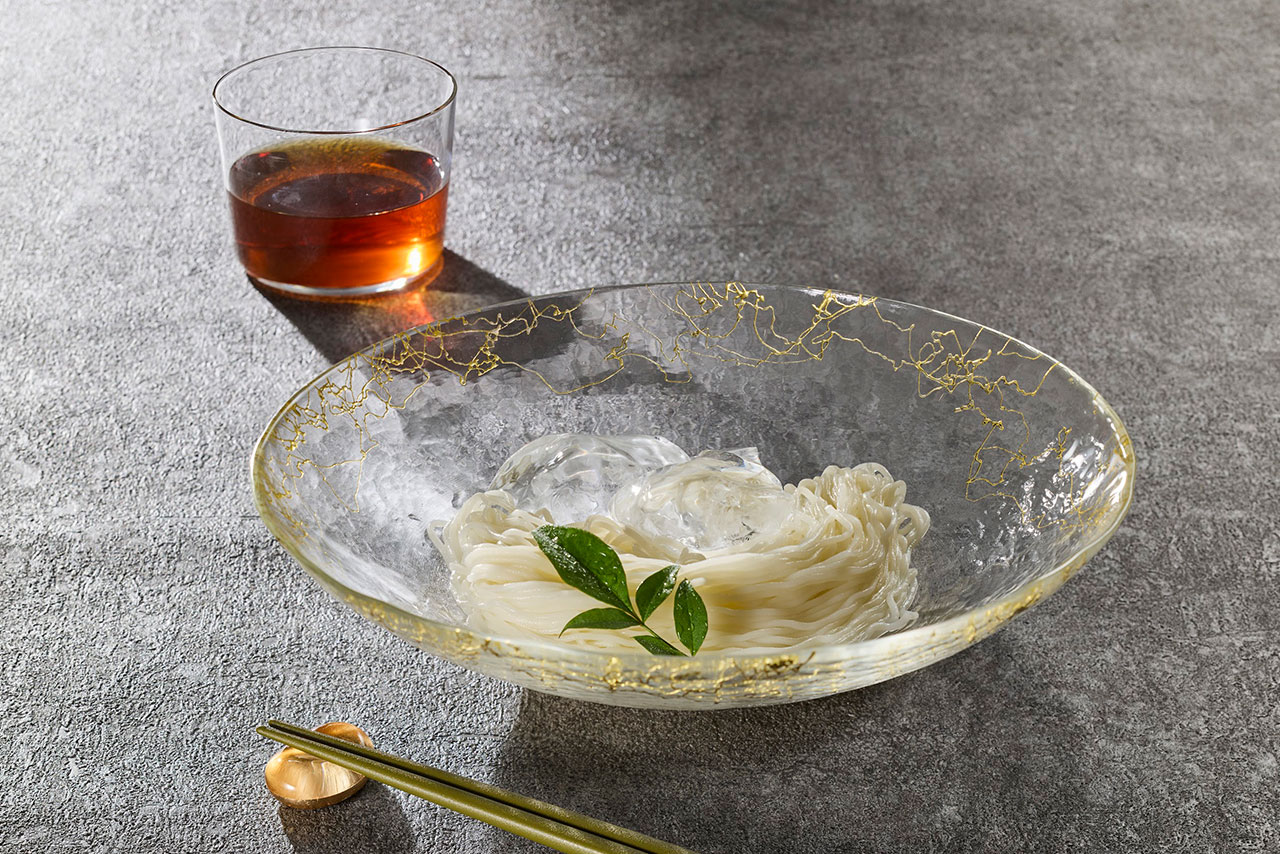 また実用性にも優れ、サラダや冷製パスタ、そうめん、フルーツなどの盛り付けに最適です。金糸のきらめきが料理の色を引き立て、日々の食卓に上質な彩りを添えます。シンプルなサラダも、器ひとつで特別な一皿に変わります。料理をおいしそうに見せる「黄青赤白黒」の5色を上手に使うことがコツだとされています。どのような食材も金糸の華やかさによって、料理をグレードアップさせることができます。
