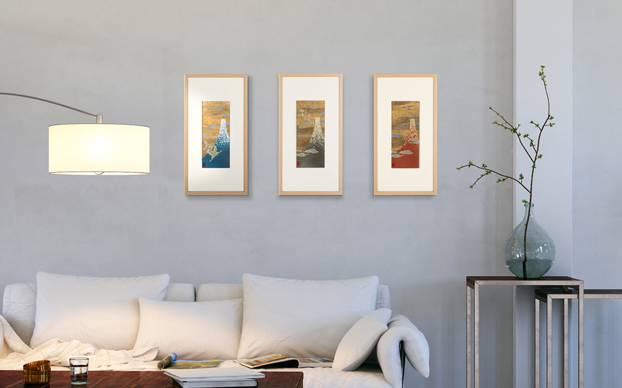 題材は、日本を代表する浮世絵師・葛飾北斎が描いた「赤富士」「鶴と富士」「昇り龍と富士」の三つの吉祥図。それぞれが持つ意味や物語を受け継ぎながら、箔一ならではの技術で新たな輝きをまとわせました。暮らしの中に“福”を呼び込む現代の縁起アートとしてご提案いたします。