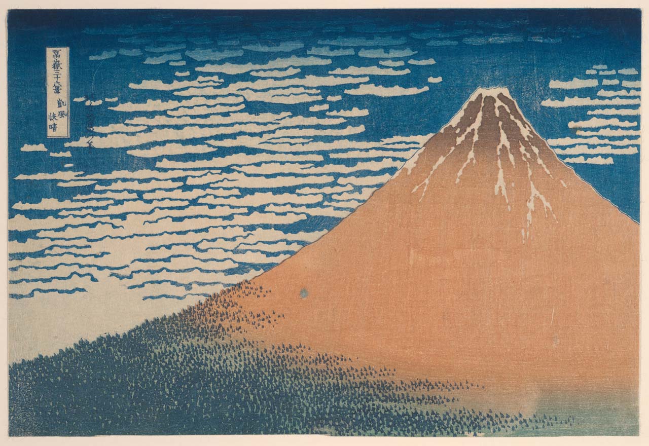 葛飾北斎による『冨嶽三十六景』の一つ、「凱風快晴」(がいふうかいせい)をモチーフにしています。早朝、太陽の光を受けて赤く染まる「赤富士」。この現象は、夏から秋にかけてのごくわずかな時期で、なおかつ空気がよく澄んだ早朝という限られた条件でしか見ることができません。そのため、古来より赤富士は最高の縁起物とされてきました。