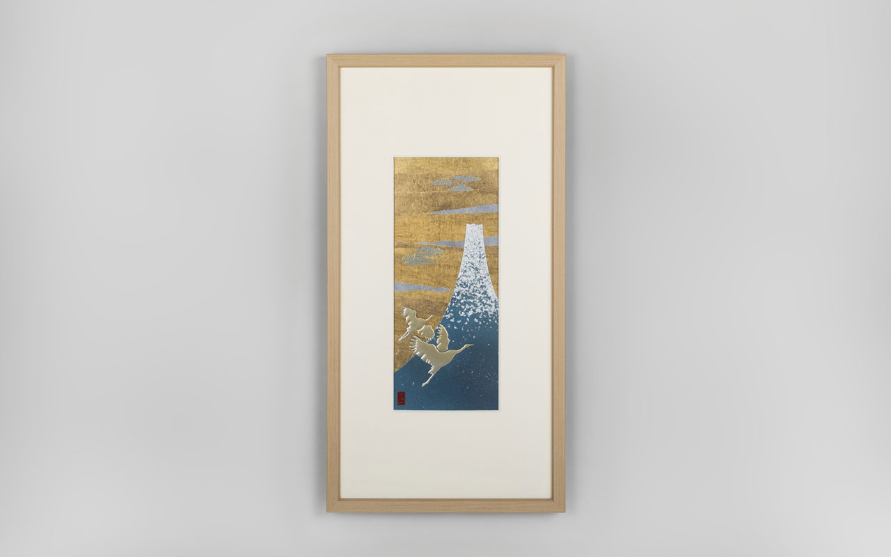 葛飾北斎による『冨嶽三十六景』の一つ、「相州梅沢左」(そうしゅううめざわのひだり)をモチーフにしています。古来より、「富士」は「不死」に通じ、「永遠の命」を意味するとされてきました。また「鶴」は長寿の象徴としてよく知られています。鶴の鳴き声は高く遠く響くことから、天の神々にまで届くとされ、人と神をつなぐ存在ともされてきました。