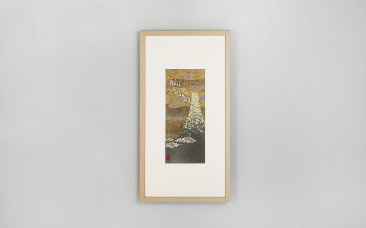 浮世絵は、江戸時代の庶民文化として人気を博しました。やがて欧州に渡ると、モネやゴッホら当代の画家に衝撃を与え、印象画の源流の一つにもなりました。対象を大胆にデフォルメして描く手法や、モチーフを平面的に表現しながらも配置や重なりによって世界感を表現するアイデアは、日本人の感性ならではの優れた美意識といえるでしょう。浮世絵の絵師たちが好んで描いたのが、日本最大の縁起物である富士山です。このシリーズでは日本が誇る浮世絵師である葛飾北斎の富士をモチーフに、箔の持つ多様な色彩と職人の技術を駆使することで、ほかにはない新しいアート作品としました。