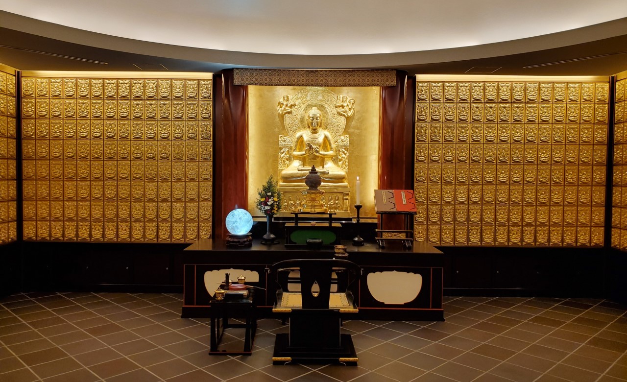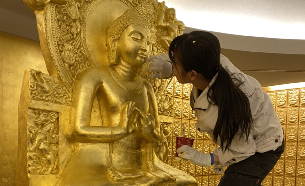 奈良県の喜光寺は、奈良時代からの歴史があり、東大寺大仏殿の雛型とされる由緒あるお寺です。新設された、佛舎利殿本尊への金箔装飾を行いました。