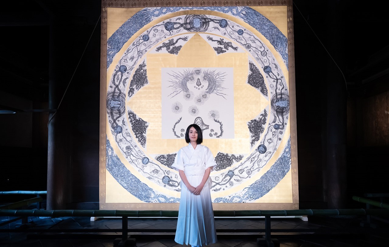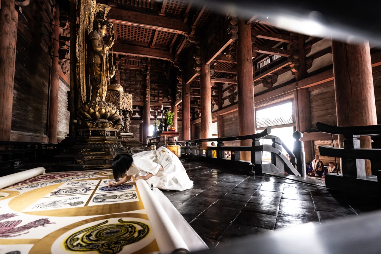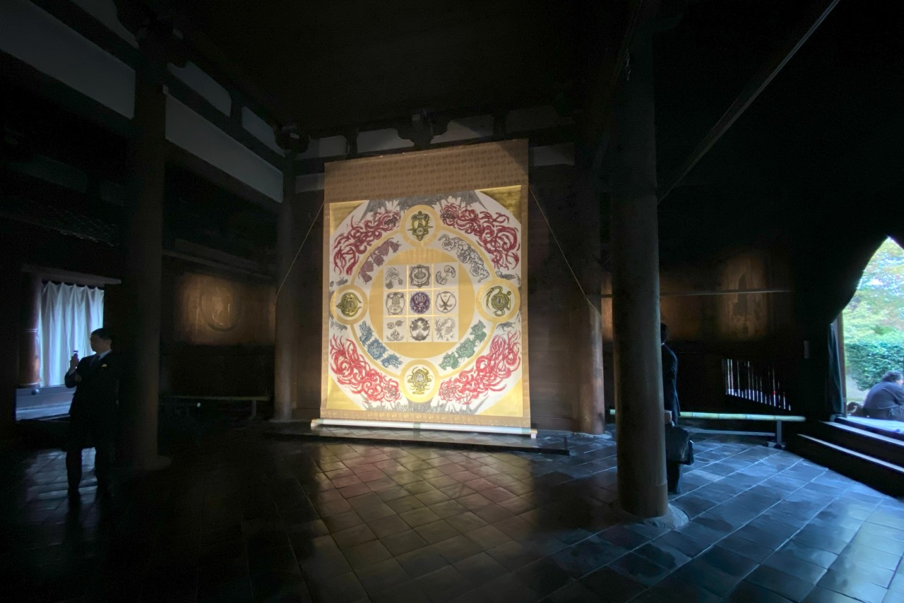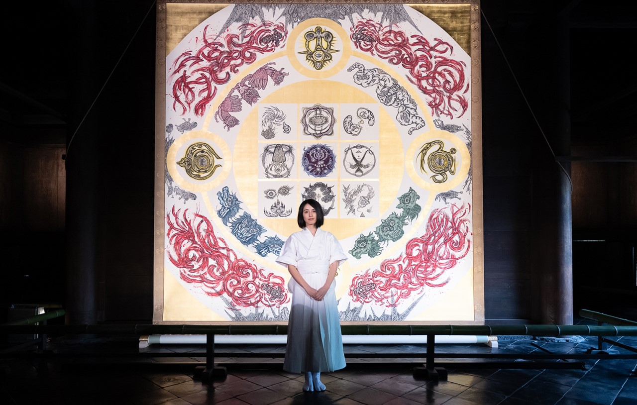 箔一の職人が箔を貼り上げた絹本は、小松美羽さんの手元にわたりました。彼女は東寺の食堂(じきどう)に籠り、素晴らしい作品を作り上げました。金箔とすべての絵が一体化した美しい作品となっています。お披露目会では、まるで金箔自体から光が発せられるかのような、美しい輝きが多くの人を魅了していました。