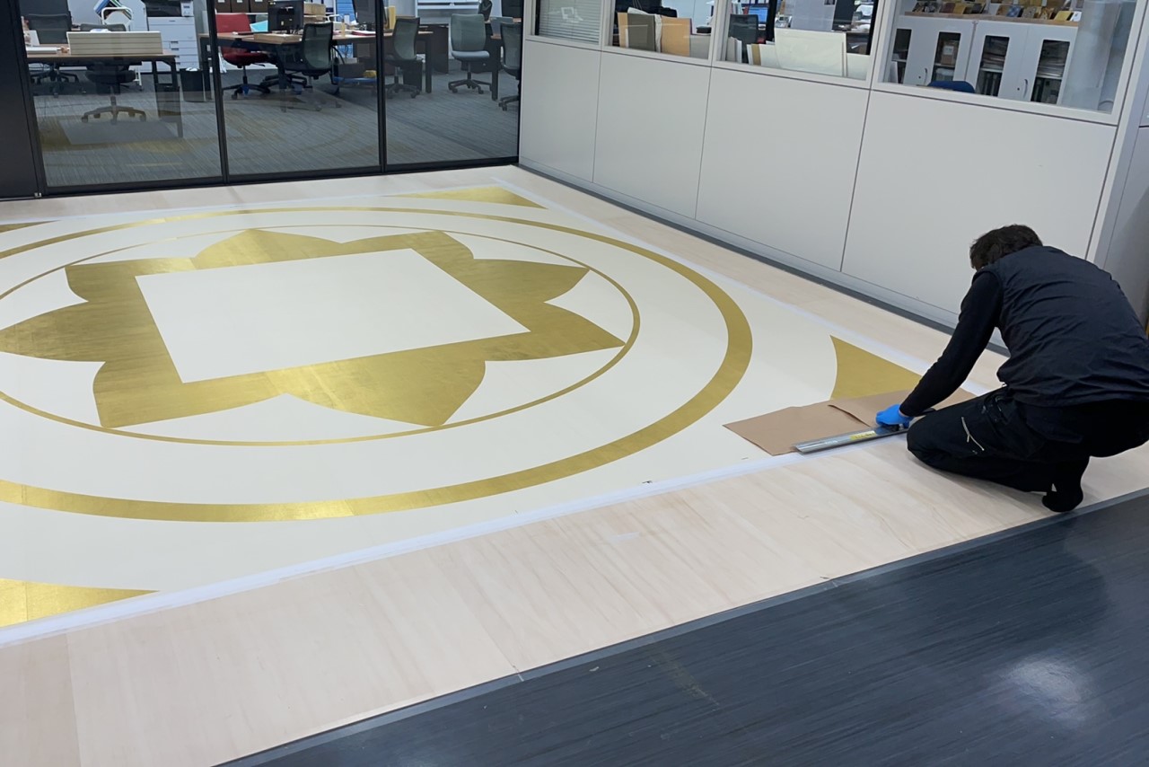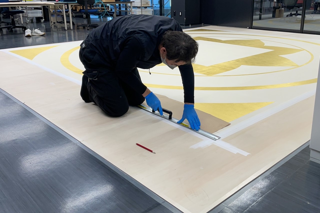 まずこの絹本に礬砂(※1)をひき、膠(※2)で箔をあしらっていきます。礬砂は水分が多いため、和紙が水を吸って膨張し、やがて乾くにつれて縮んでいきます。4mもの大きさがあると、伸縮幅は数センチにも及びます。一方で、箔を美しく貼るためには常に和紙をピンと張っておかなければなりません。縮んだ状態で固定すると、伸びたときにたわみます。逆に伸びたときに合わせれば、縮んだ際に和紙が破れるおそれもあります。今回の絹本は特注品のため予備はなく、失敗が許されない中での繊細なコントロールが続きました。