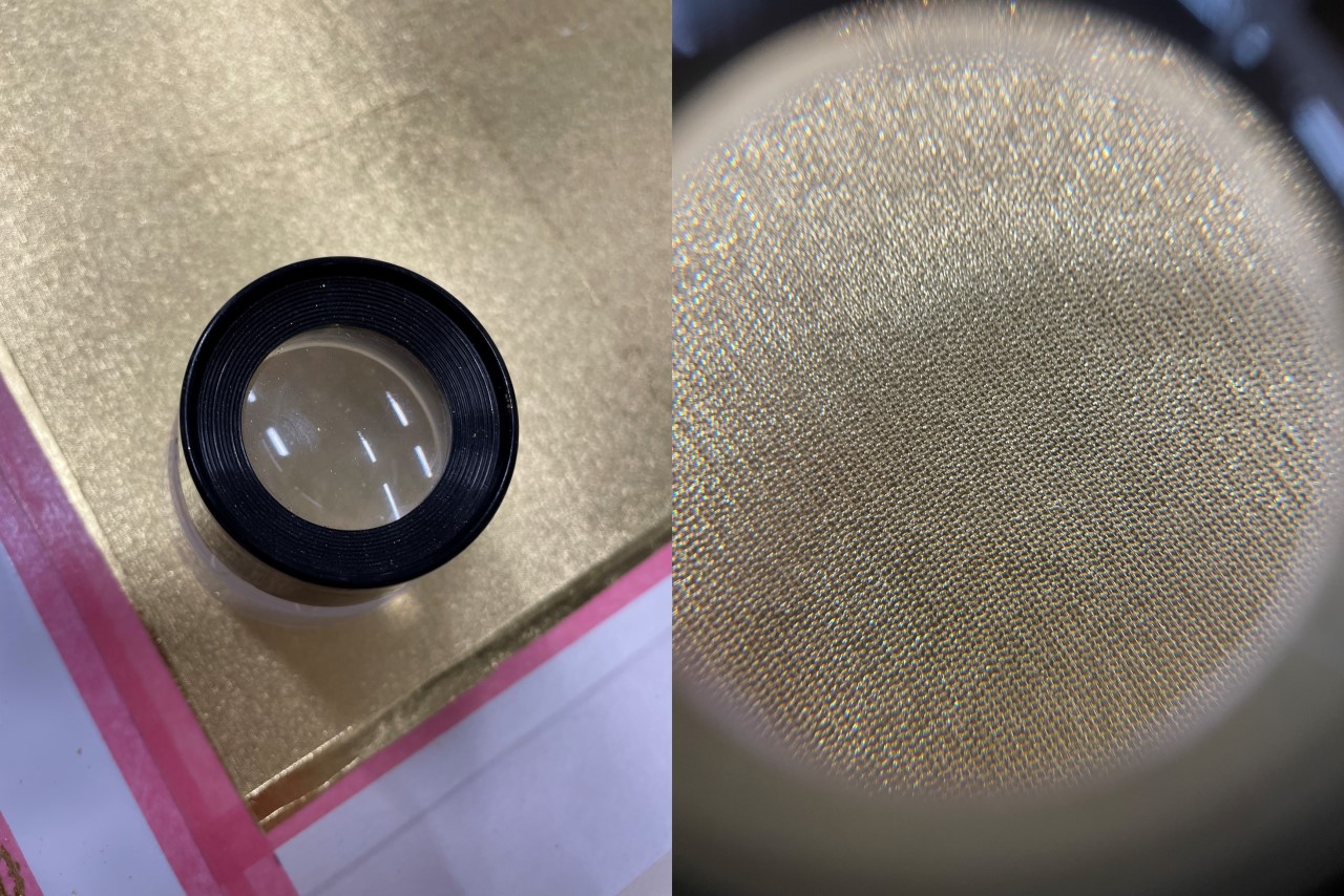 拡大鏡で見ると、絹の縫い目にきっちりと金箔が入り込んでいることが分かります