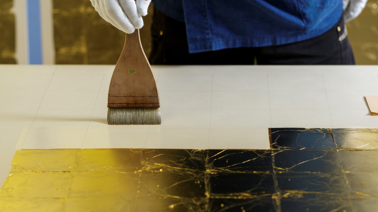絹本の魅力はその高貴な光沢感です。これは、絹が本来持っている光沢に加え、その格子状の縫い目に光が複雑に反射することによって生まれるものです。絹本への箔押しは、この美しい絹の質感と箔を融合させなければなりません。絹の光沢を活かすには、その縫い目の一つひとつにまで箔が入り込むように丁寧に箔をあしらっていく必要があります。職人の丁寧な手仕事によって、絹ならではのテクスチャーが存分に生かされ、まるで「黄金の絹」がそこにあるかのような高貴な輝きを持った絹本となりました。