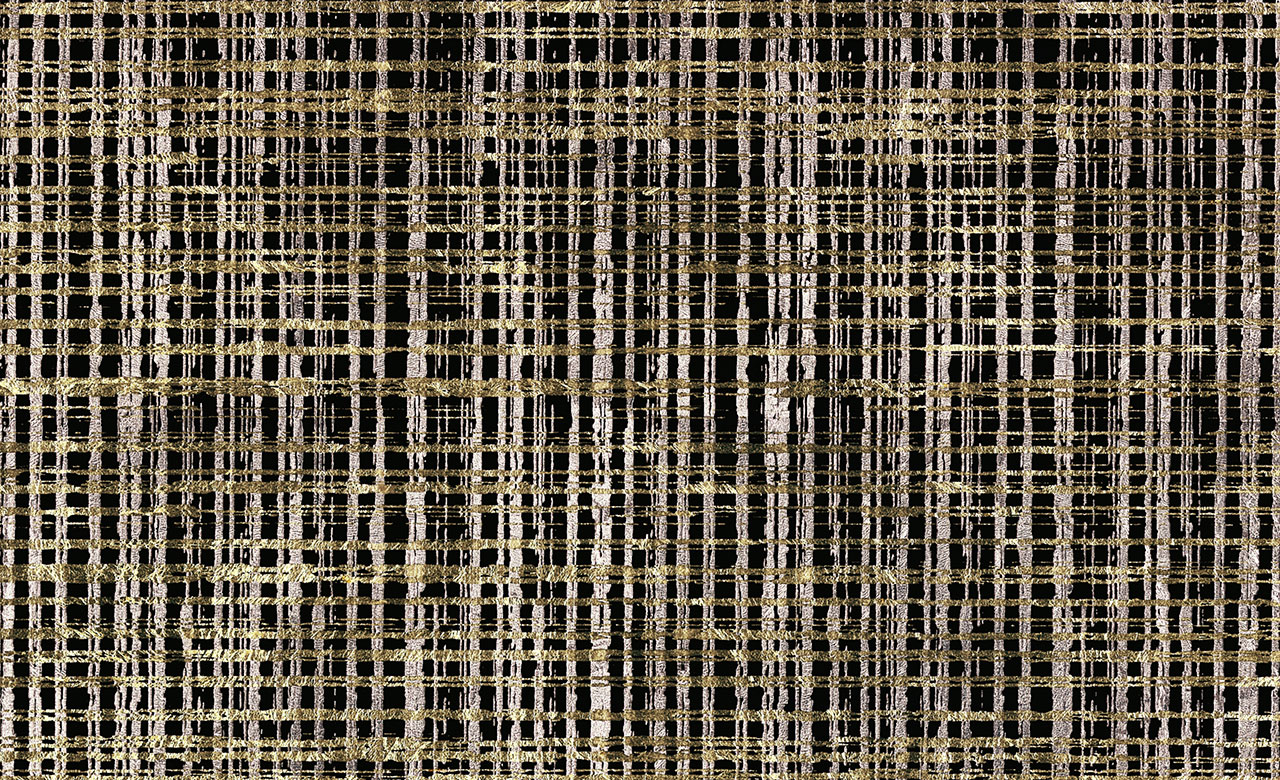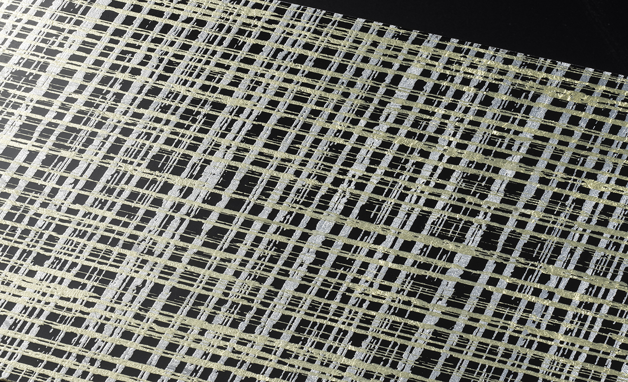 サイザル麻のクロスのような、自然素材を編んだ細かい格子状のパターン柄を箔で表現しています。 二色の箔を組み合わせ、立体感あるテクスチャーに仕上げています。