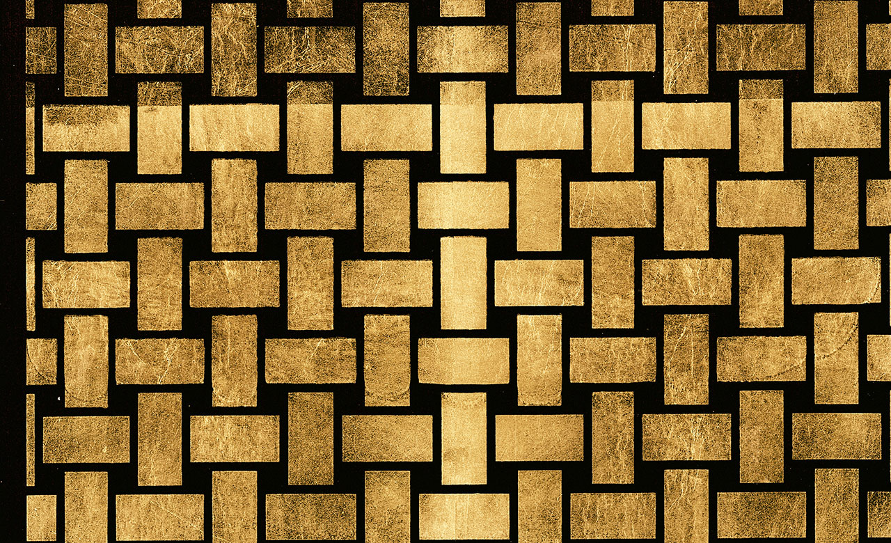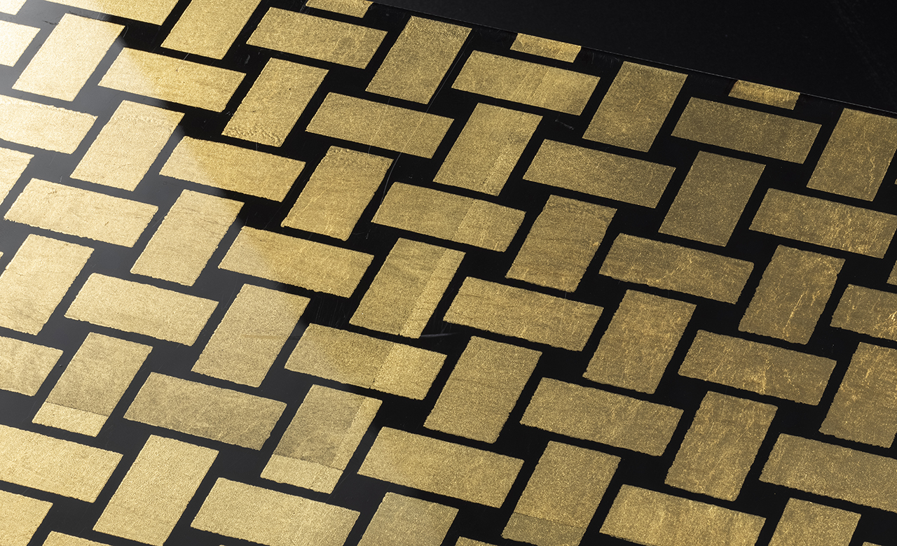 伝統的に天井によく用いられる網代の模様の一つ、籠目は網代の中で唯一下地を見せる編み方の模様です。下地に黒を用いて金箔とのコントラストを際立たせ、華やかな印象に仕上げています。