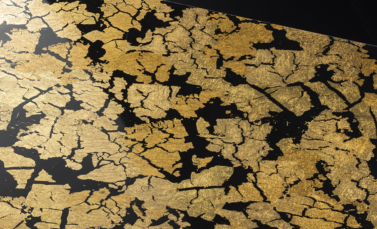 紅炎をイメージし、ちぎりの二色の箔をバランスよく配置しながら、太陽の黒点や粒状斑を表現しています。二色の箔が放つ光沢が、より一層、雅やかなデザインに仕上げてくれています。