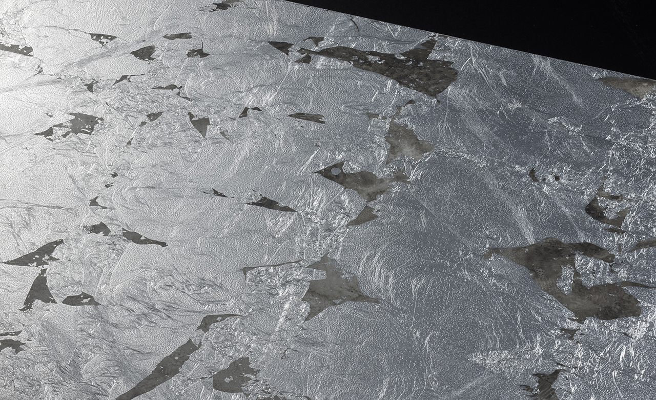 箔皺を活かし、あえて箔を荒らしながら貼ることで、無機質な雰囲気になりがちなアルミの表情に躍動感を与えています。箔の隙間から覗かせる墨流しの様なぼかしを施した地模様との組合せが、よりスタイリッシュなデザインに仕上げています。