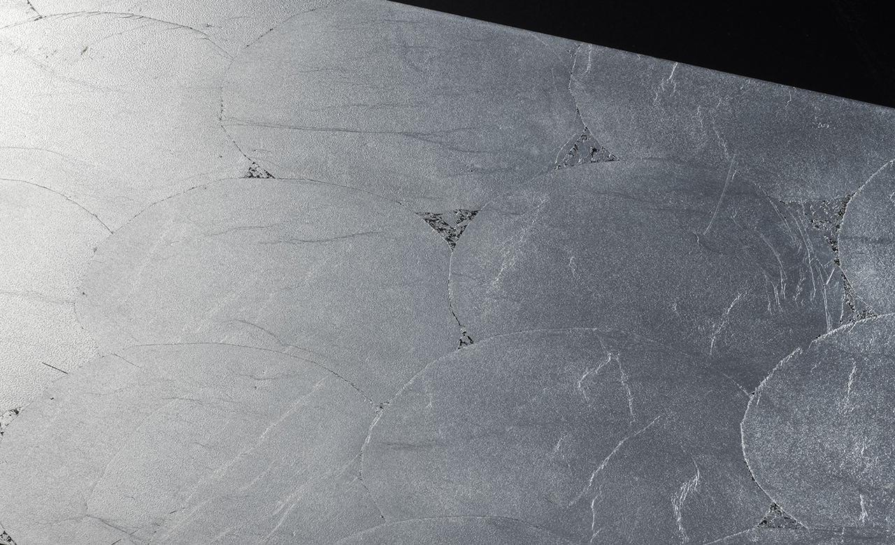 月光が冴えて地上を白く照らす様子を表現しています。神秘的な月の光は柔らかく、どこか力強い。箔皺を活かしながら、円形のピースを貼り重ねていくことで、しなやかさと力強さの絶妙なバランスを表現しています。