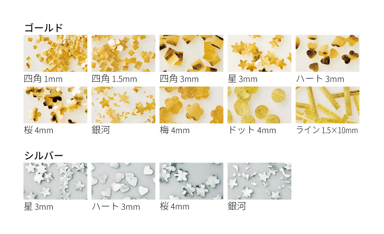ハート、星、花びらなど様々なカタチの金箔が、食材を遊び心たっぷりに演出します。